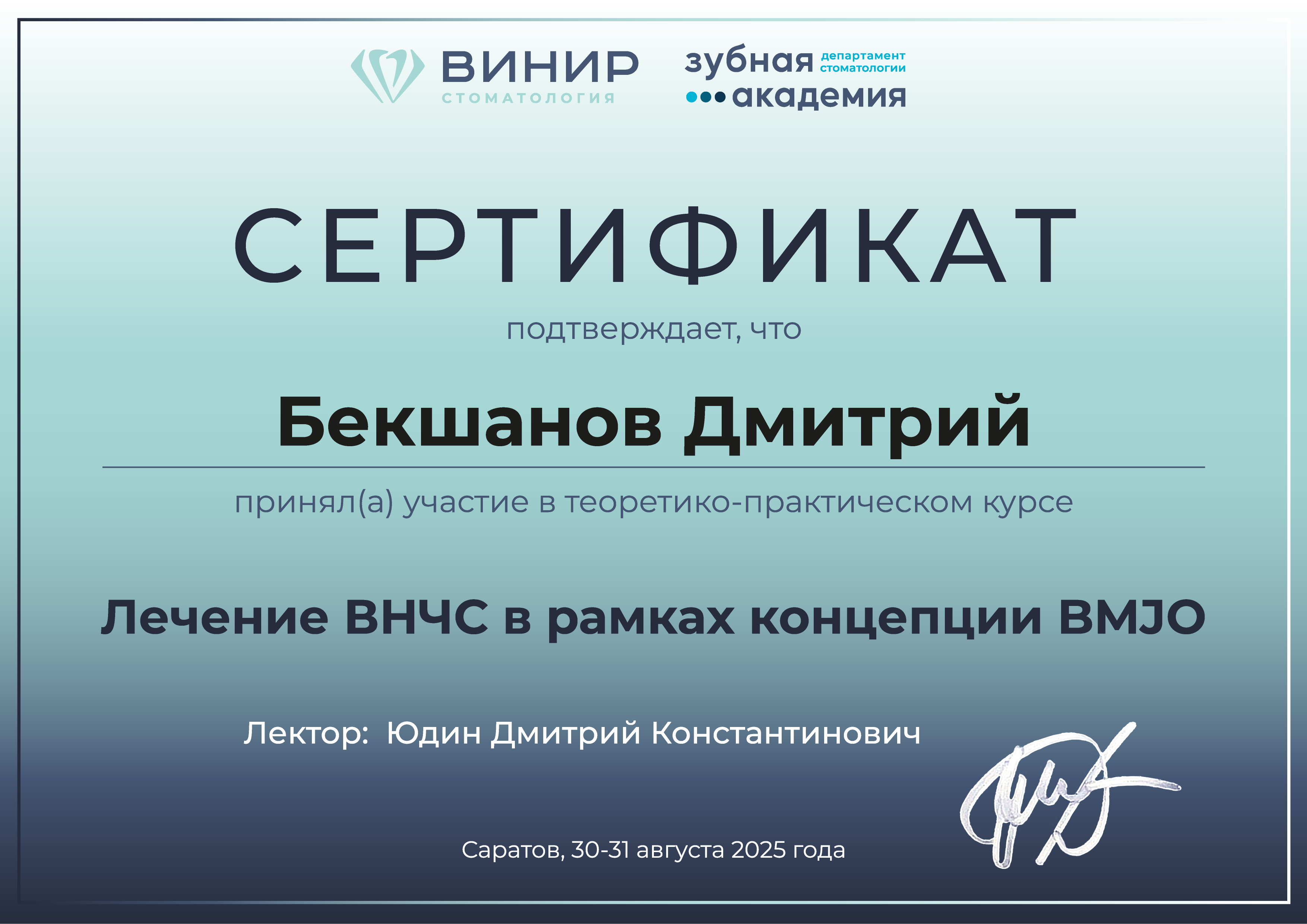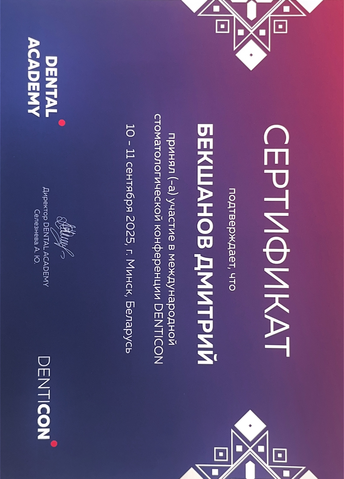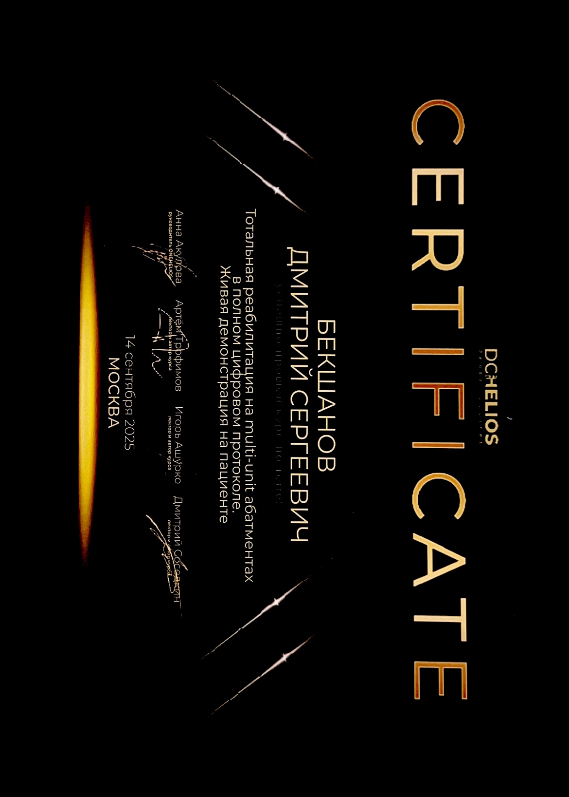 - сертификат «Стоматология ортопедическая» № 1164242978110. Выдан 28.12.2020