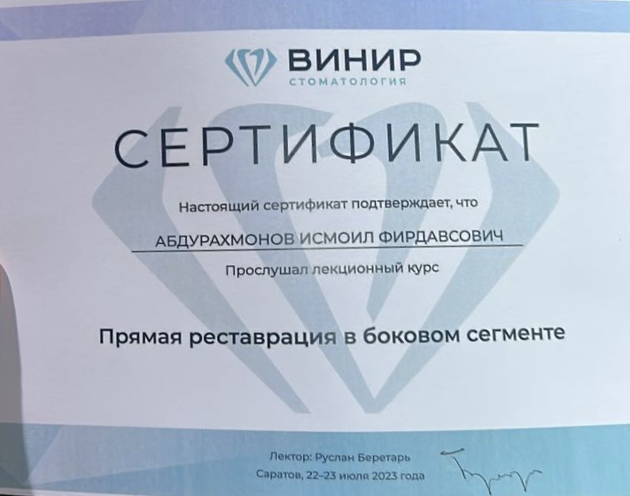 Диплом по специальности «врач-стоматолог» №1007 от 26.06.2025