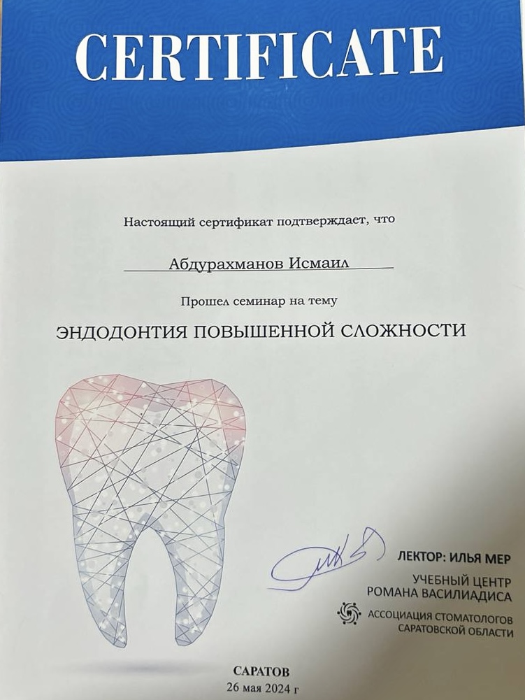 Диплом по специальности «врач-стоматолог» №1007 от 26.06.2025