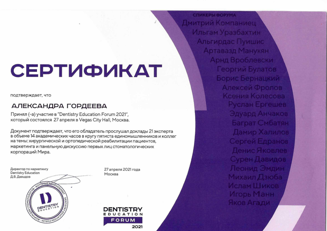ФГБОУВО "Саратовский государственный университет имени В.И. Разумовского" МЗ РФ г. Саратов, диплом 106434 001436 от 31.08.2021 Врач-стоматолог - хирург.