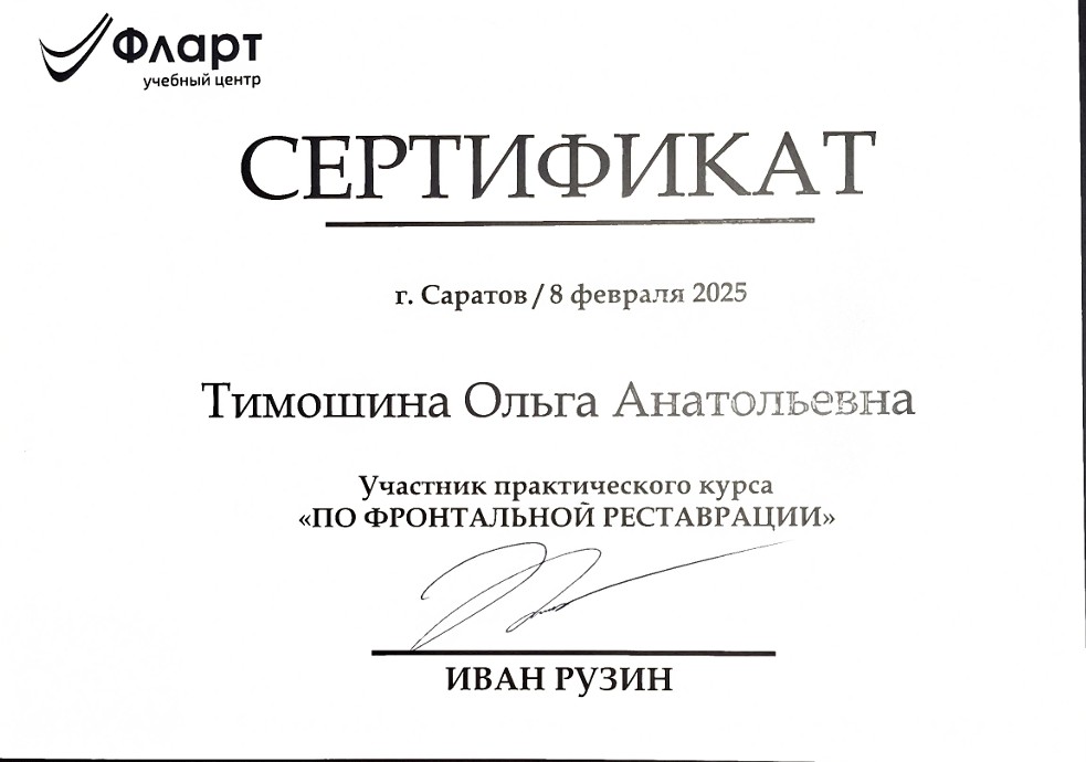 Сертификат специалиста Протокол Nº 201 о т 23.12.2020г . Допущен к осуществлению медицинской или фармацевтической деятельности по специальности (направлению подготовки) “Стоматология терапевтическая” №1123242492653 Регистрационный Nº 2509, Краснодар, выдан 23.12.2020г.