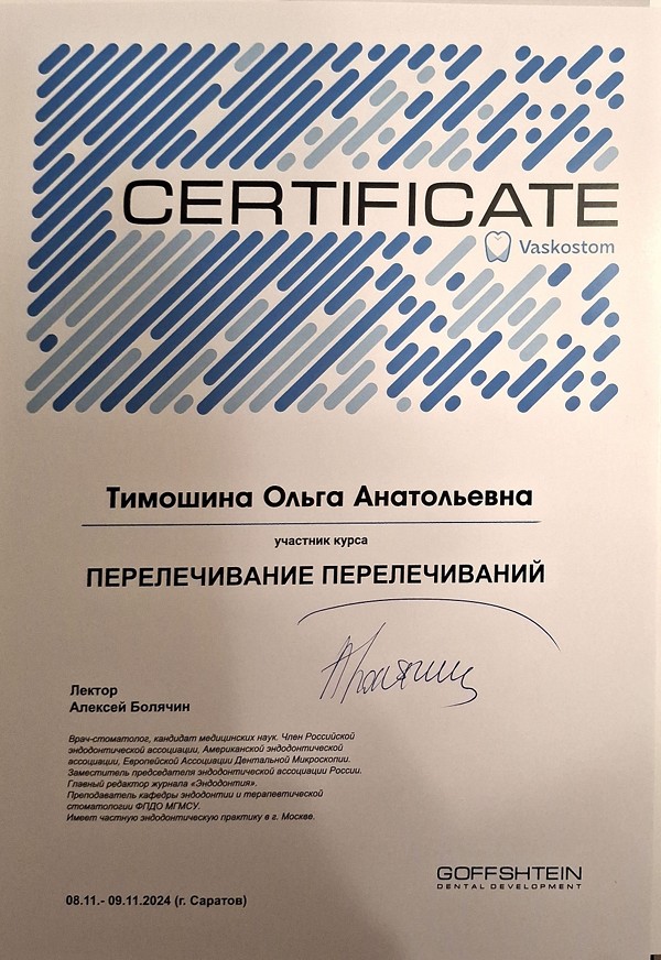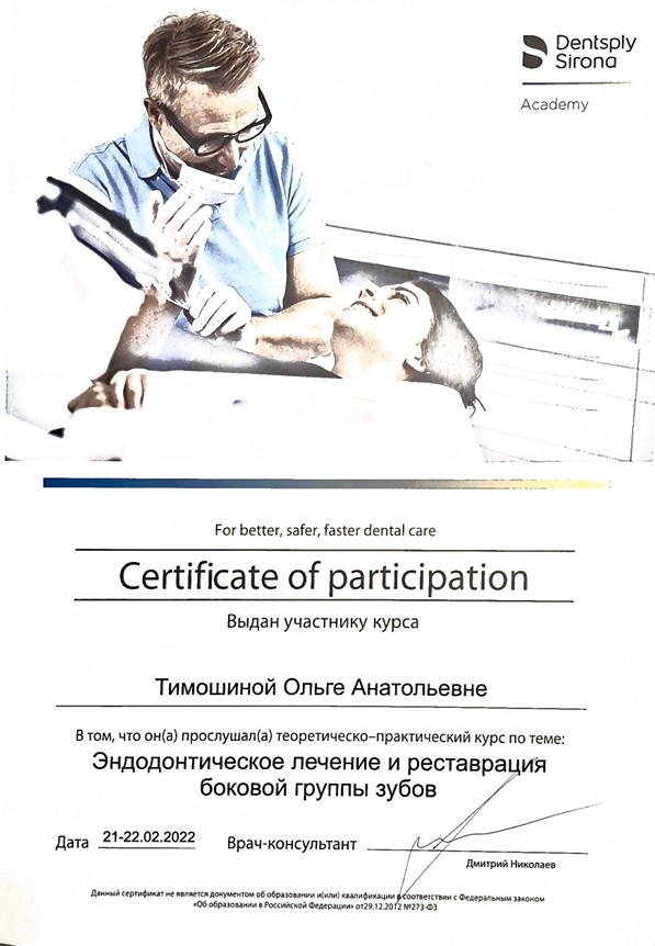 Сертификат специалиста "Стоматология терапевтическая" №1163240505262, Регистрационный номер 704, Самара, выдан 17 июня 2016 года