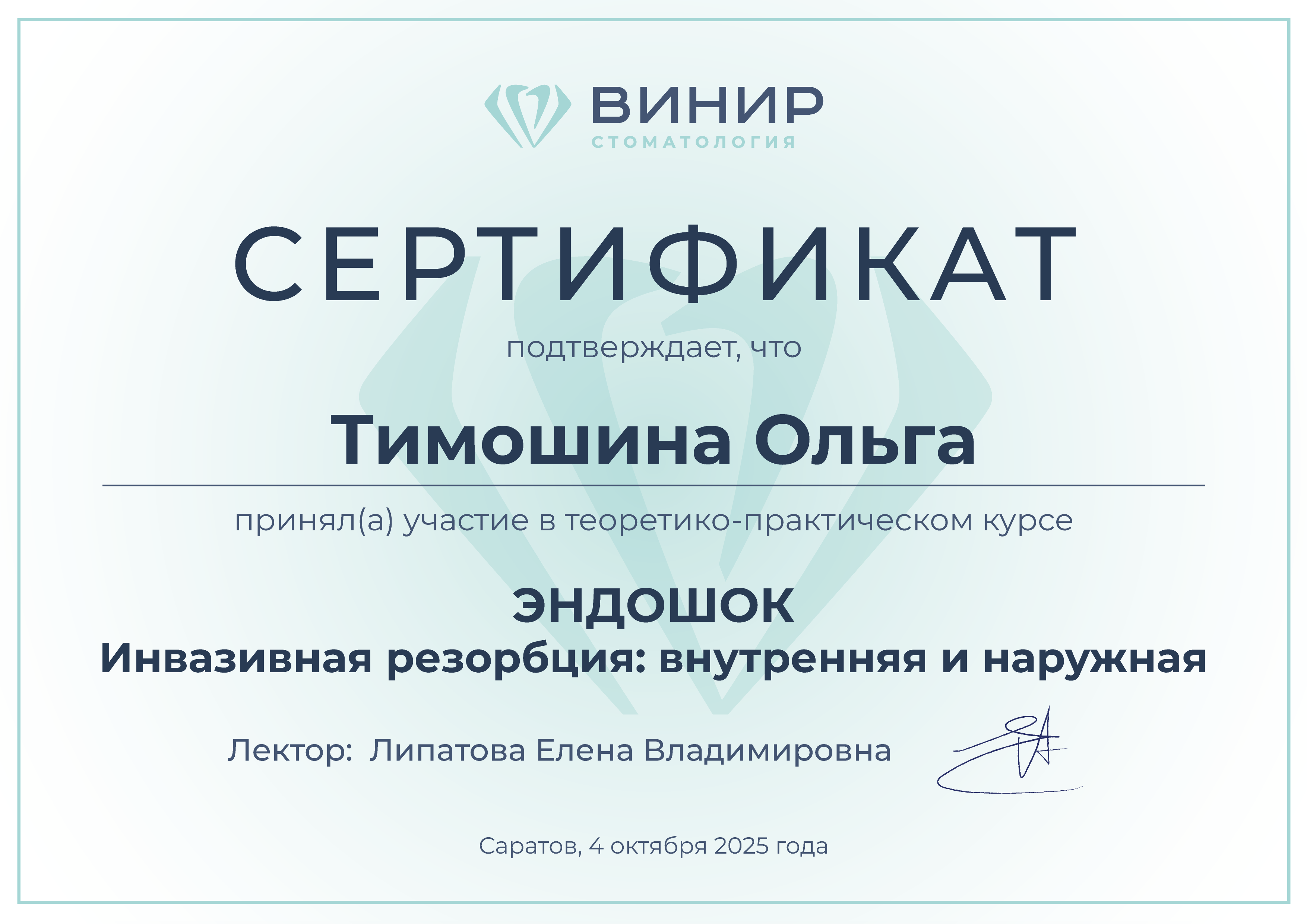 Сертификат специалиста "Стоматология терапевтическая" №1163240505262, Регистрационный номер 704, Самара, выдан 17 июня 2016 года